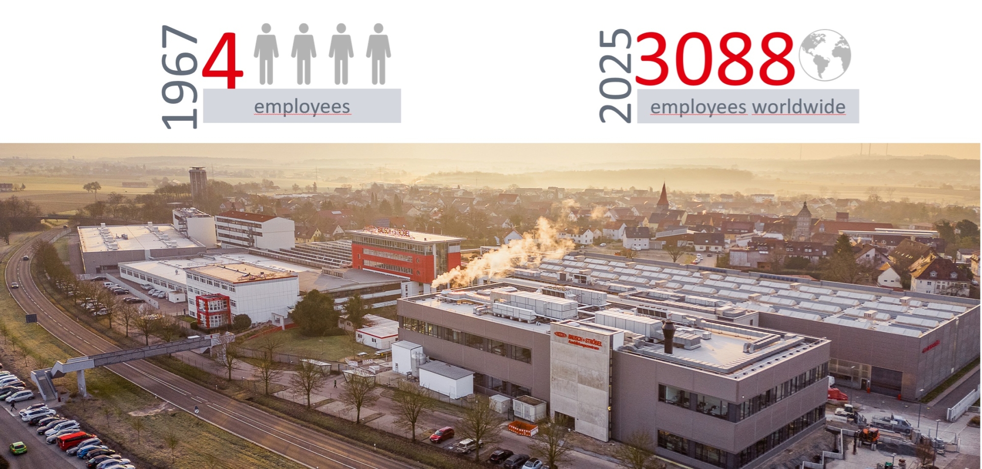 1967年、わずか4名のスタッフによる小さな一歩からBAUSCH+STRÖBELの歴史は始まりました。創業以来、技術革新と品質への情熱を注ぎ続けた結果、現在では全世界で3,088名の従業員を擁するグローバル企業へと成長を遂げました。